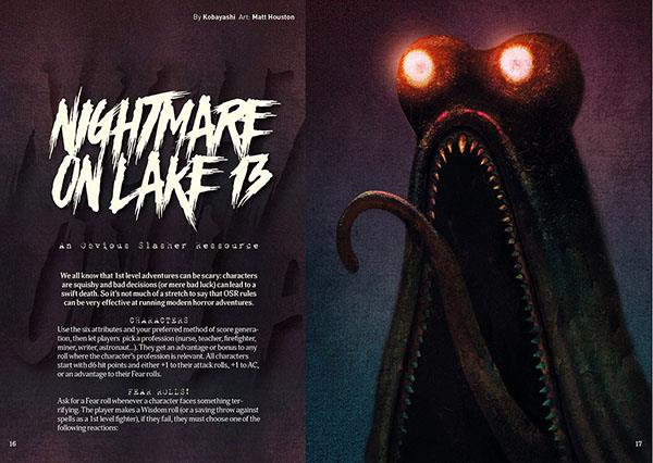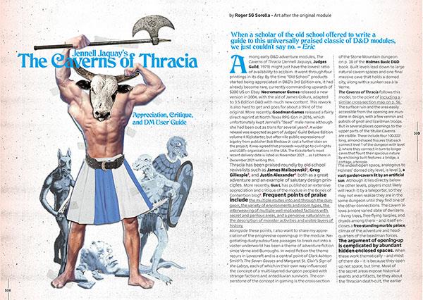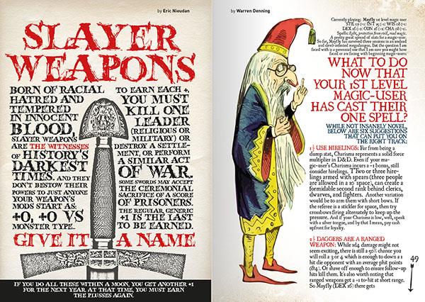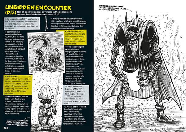 And here is another 212 pages full of adventure gaming goodness from every h(osr)rizon. Issue the Third is yet another thick, slick brick of that magical brew of old and new across the spectrum of our common interests: game design essays, refereeing advice and procedures, weird AF encounters and NPCs, a mini-game or two, and of course a helmetload of random tables for all sorts of uses. The Portfolio of Cartographic Curiosities section contains seven maps, the Menagerie of Monstrosities is creaking under the weight of seven unique monsters, and the Retinue of Rogues presents six new classes for your classic deehendee.