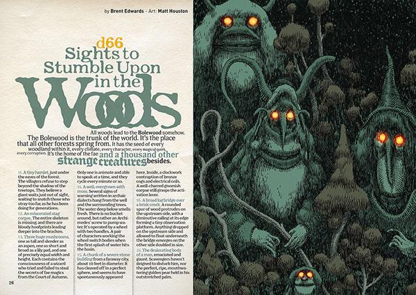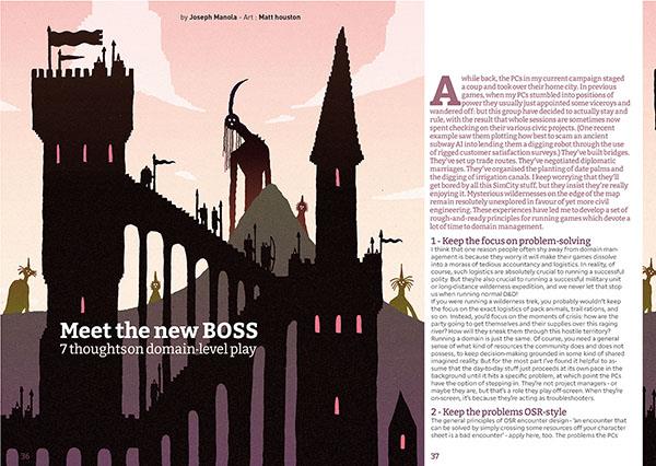 • Format: 212 pages (A5 format: 5.9’ x 8.25’, slightly bigger than digest size) in beautiful full colour, printed on quality paper (coated 130 gr, with a cover on coated 300 gr) by Olivier’s neighbours in Bilbo (sic), Basque country. The dust jacket contains a sandbox adventure by Thomas Rey and Eric Nieudan and the bookmark has a die-drop table for weird character backgrounds byPhill Loe.